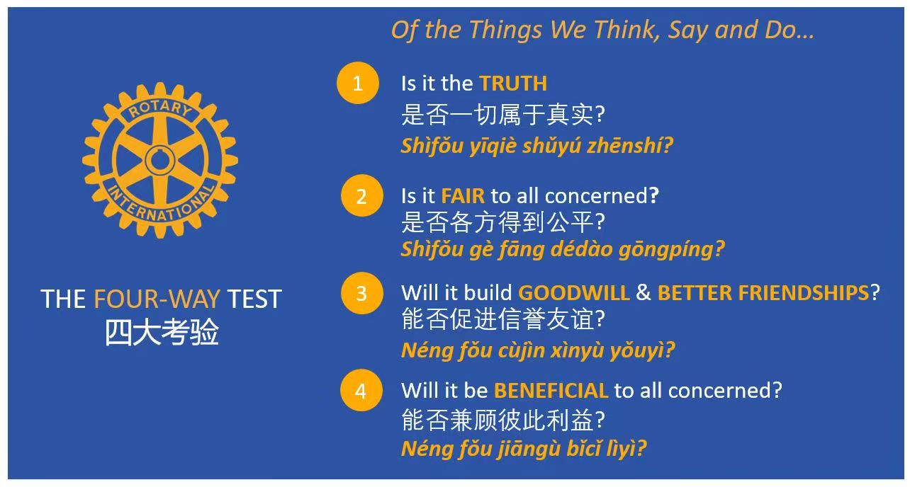 “扶轮社是一个由世界各地的商界和专业人士组成的组织,致力于提供人道主义服务,鼓励各行各业遵守高道德标准,帮助在世界上建立善意与和平。”